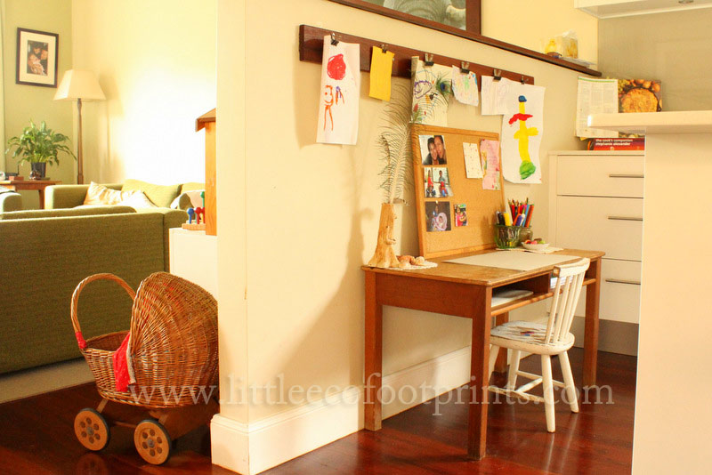 Her craft corner includes child-sized chairs and nearby a set of draws stores craft materials. We try to keep this table clear and inviting. When she was younger I helped her keep it tidy, but now that’s her responsibility. She quickly learnt that a cluttered corner isn’t an inviting space and she (still with a little persuasion) tidies up after herself.