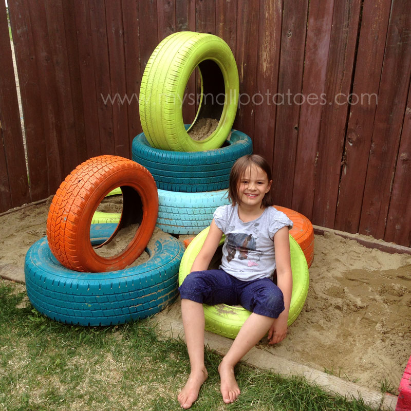 We love our little tire climber. My kids especially like to gain a different perspective of our backyard by standing up on the tippy top tire. The smalls dig around with shovel and bare toes and just enjoy the textures and the climbing.