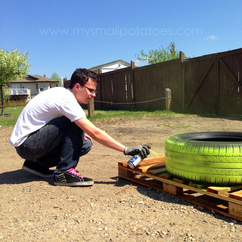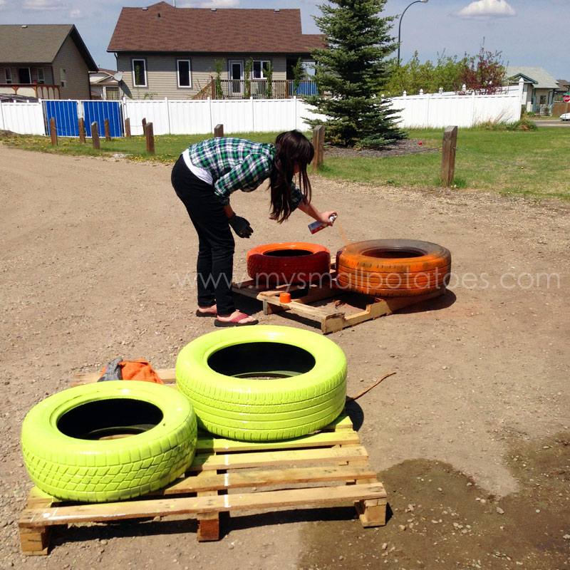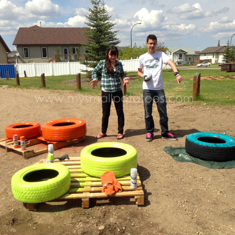 My teenagers were happy to oblige when it came to the painting of the old tires…