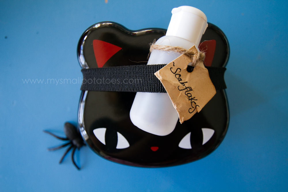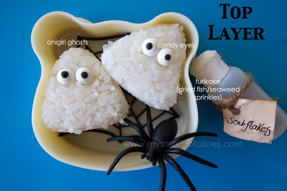 I created the carrot gravestones by slicing a carrot on an angle, cutting the bottom off, and punching the letters through the top with little ABC cuttersgravestoneCarrotsThe top layer is quick and easy, but looks absolutely adorable with its onigiri ghosts…topLayerTo create these little ghosts, cook a batch of sticky rice, scoop them into triangle molds, press, and expel, or wrap the scoop of rice in plastic wrap and shape by hand. The candy google eyes can be purchased at craft stores, or here.onigirighostsMy little ones love furikake on their rice, so I packed some in a little plastic bottle and gave it a creepy label…”scab flakes!” Ew.scabflakesAnd that’s it…maybe 20 minutes to put it all together…bothlayers
