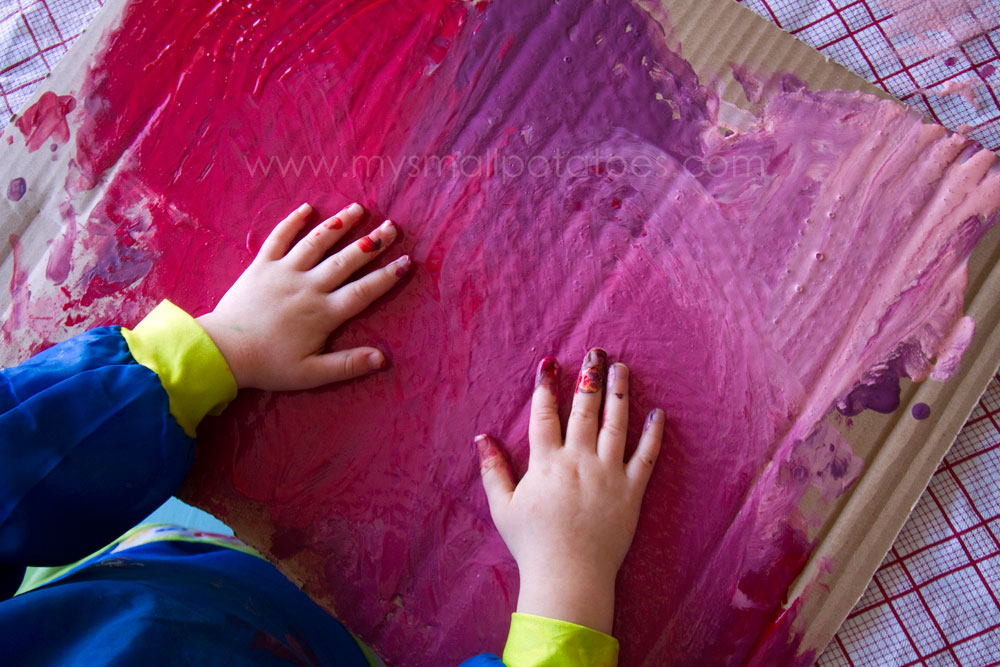 We like to use cardboard for finger painting when we are not painting directly on the table surface. The thickness of the cardboard allows for loads and loads of layers, smushing, smearing, and poking. No small has ever worn a hole through a piece of cardboard from finger painting. This is a bonus because creative art should not involve tears of frustration or sadness, only love, trial and error, and happy exploration.