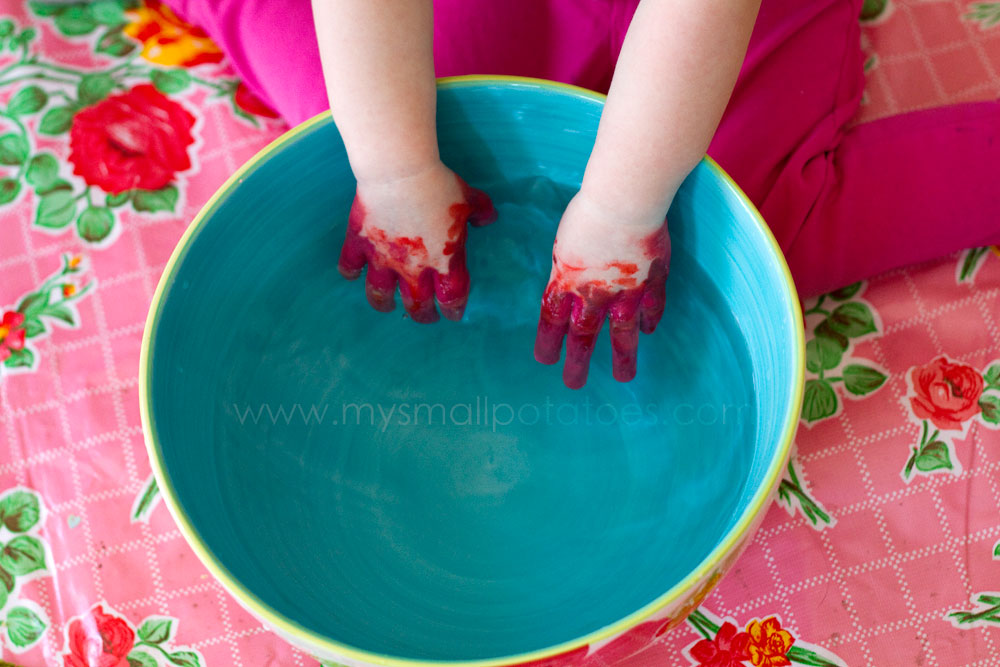 And please don’t be discouraged by the “mess” of finger painting. First of all, it’s the prettiest mess you’re likely to see all day. Secondly, it all washes away in a nice warm bowl of water…which we keep right next to the table so there is no dripping hands finding their way all the way to the bathroom sink.