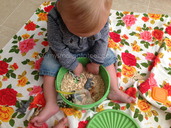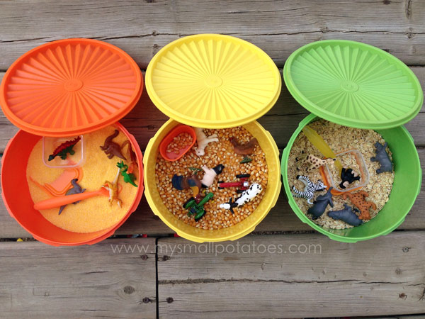 7. Great ideas! I love the covered container idea so you can pack it up and come back to it later. When my two older kids were into sensory play, I put animals into one bin with rice and large puzzle pieces in the other for my older child. It helped level out the activity a bit.