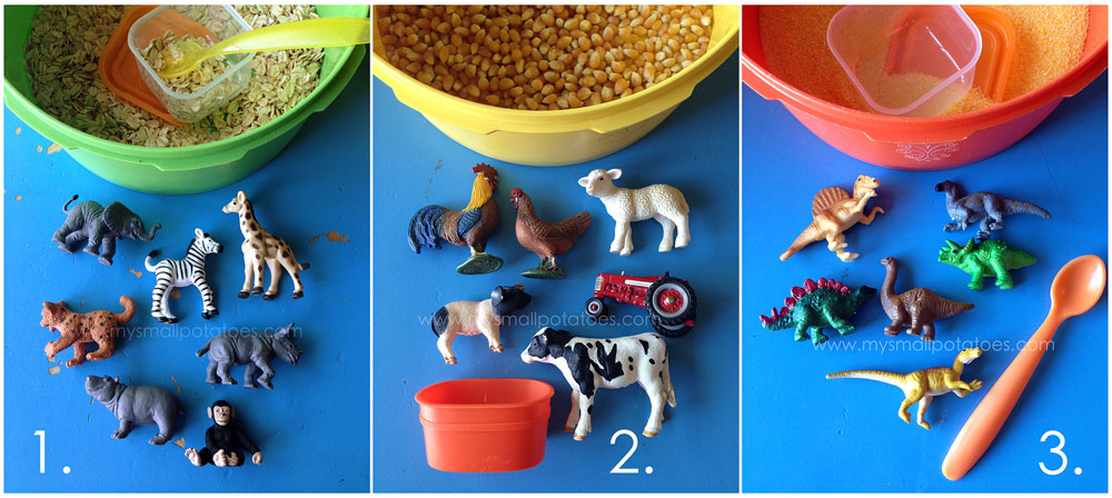 When I designed these portable bins, I had the younger crowd in mind. Gluten-free oats, and cornmeal are great for the babies and toddlers, while the un-popped corn is more suitable the older toddlers. All the toys are big enough that they won’t be choked on, but small enough to fit in the smaller containers.allthreebins