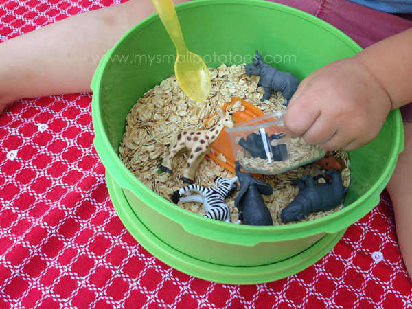 1.  Visit Africa…gluten-free rolled oats, a clear container and lid, a tiny spoon, and plastic baby animals from Africa. These little baby animals come from the Zoo Babies Toob by Safari Ltd.