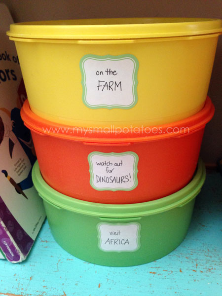 I used vintage Tupperware containers I found at the thrift store for our play bins. You could use any small container with a lid. I prefer round ones, as they naturally fit between a small person’s legs when they are sitting.