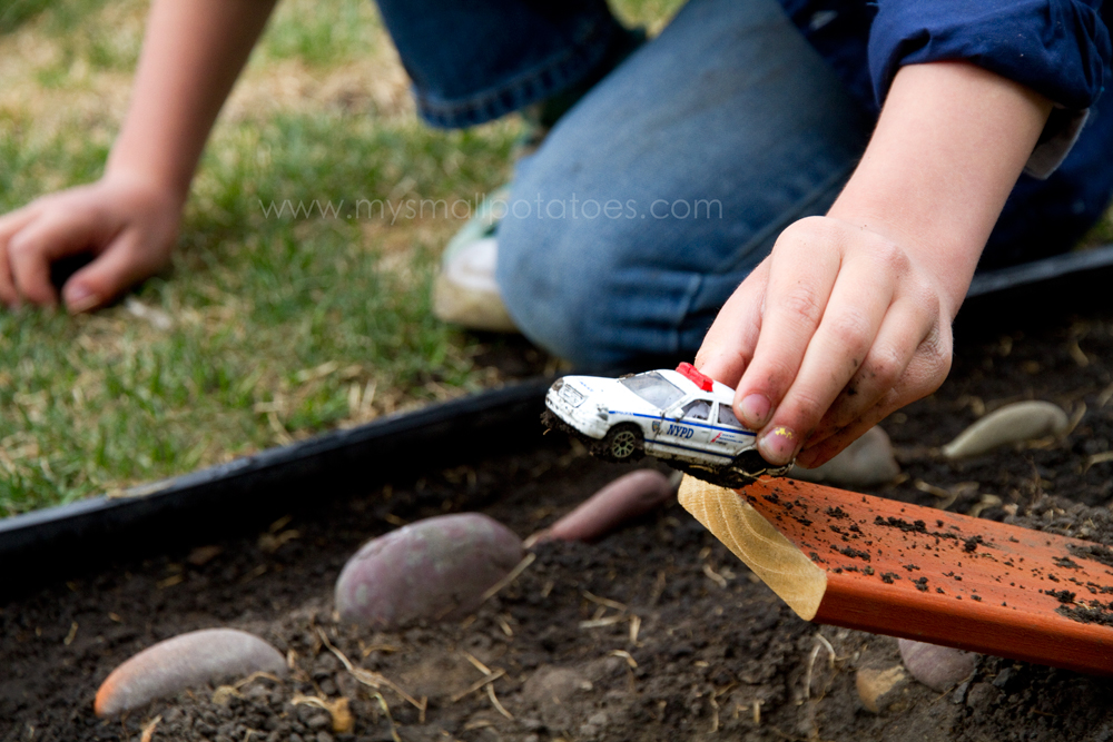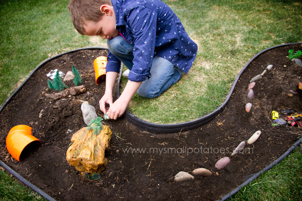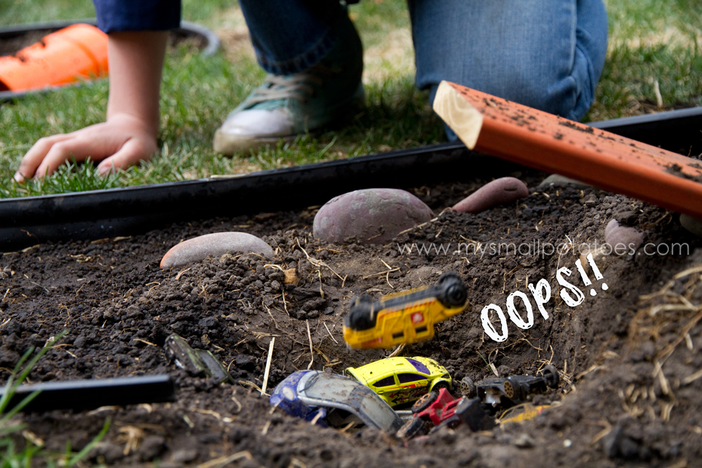 Make sure you don’t make the tunnels so long that your child cannot reach his hand in one end and out the other…we don’t want the cars to get stuck somewhere in the middle! I buried the tunnels about a third of the way in, leaving enough room to fit an arm in, but with enough dirt on the bottom of the tunnel to keep it anchored.
